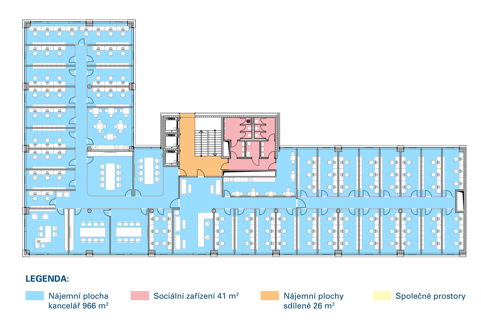 Vzorová dispozice – 3 nájemci – koncept velkoprostorová kancelář